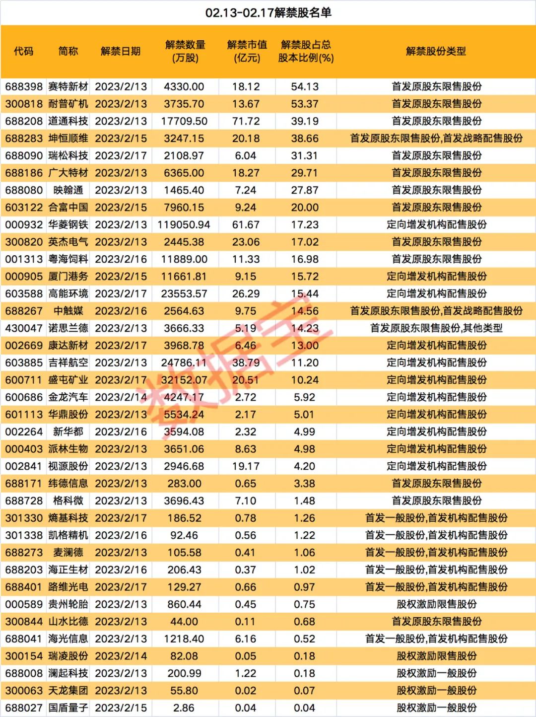 证券时报・数据宝统计,2月13日至17日,A股市场中将有37家上市公司迎来限售股解禁。以个股最新价计算,37股解禁市值合计430.29亿元。